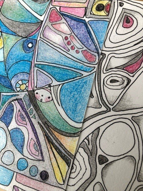 「楽々あーと」の彩色線画とは、身近にある画材で自由な形を描き、○△□を変化させて「楽しむ心と個性」を大切に、思いつくまま色付けし、自分唯一の作品を描く遊びの様な講座です。(子供から大人まで年齢問わず。)