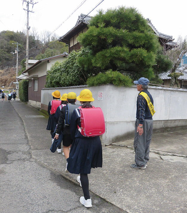 第1・第3水曜日の登下校時に、地域の子どもの安全を地域住民で守ることを目的に、通学路の安全と下校時の子どもたちを見守っています。子どもたちと一緒に歩いたり、家の近所の交差点に立ったり、畑仕事のかたわら声を掛けたりと、地域の「おじさん・おばさん」たちができる方法で活動を行っています。