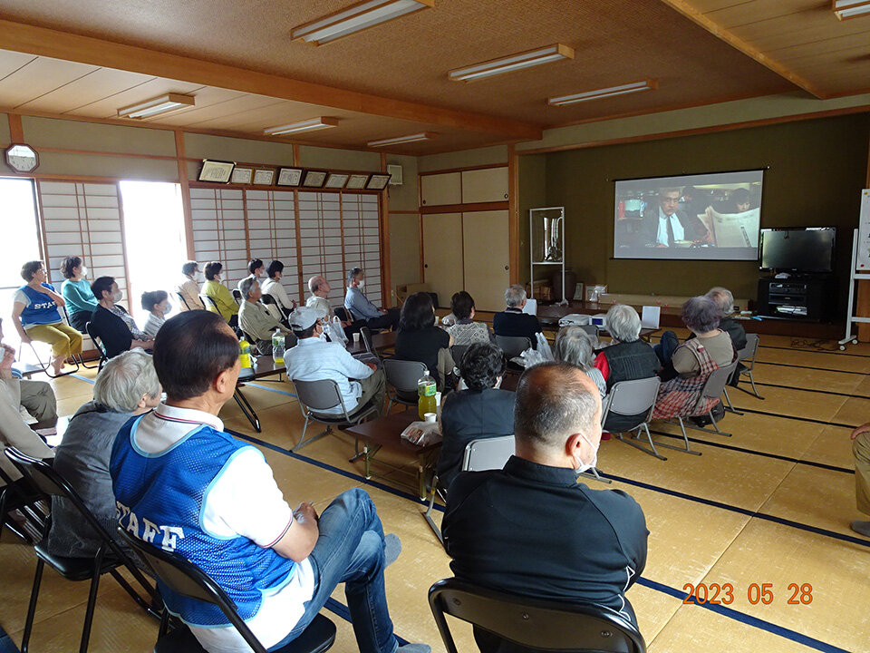 令和5年から始まった新たな活動。シニア世代の居場所づくりのひとつで、8地区の自治会にある公民館の持ち回りで映画を上映するイベントを開催しています。これは、コミュニティセンターまで来られない方に配慮したもので、自宅の近所で参加しやすいと好評です。情報交換の場にもなっており「あの映画が面白かった」などの話があると、次の上映会の参考にもしているそうです。