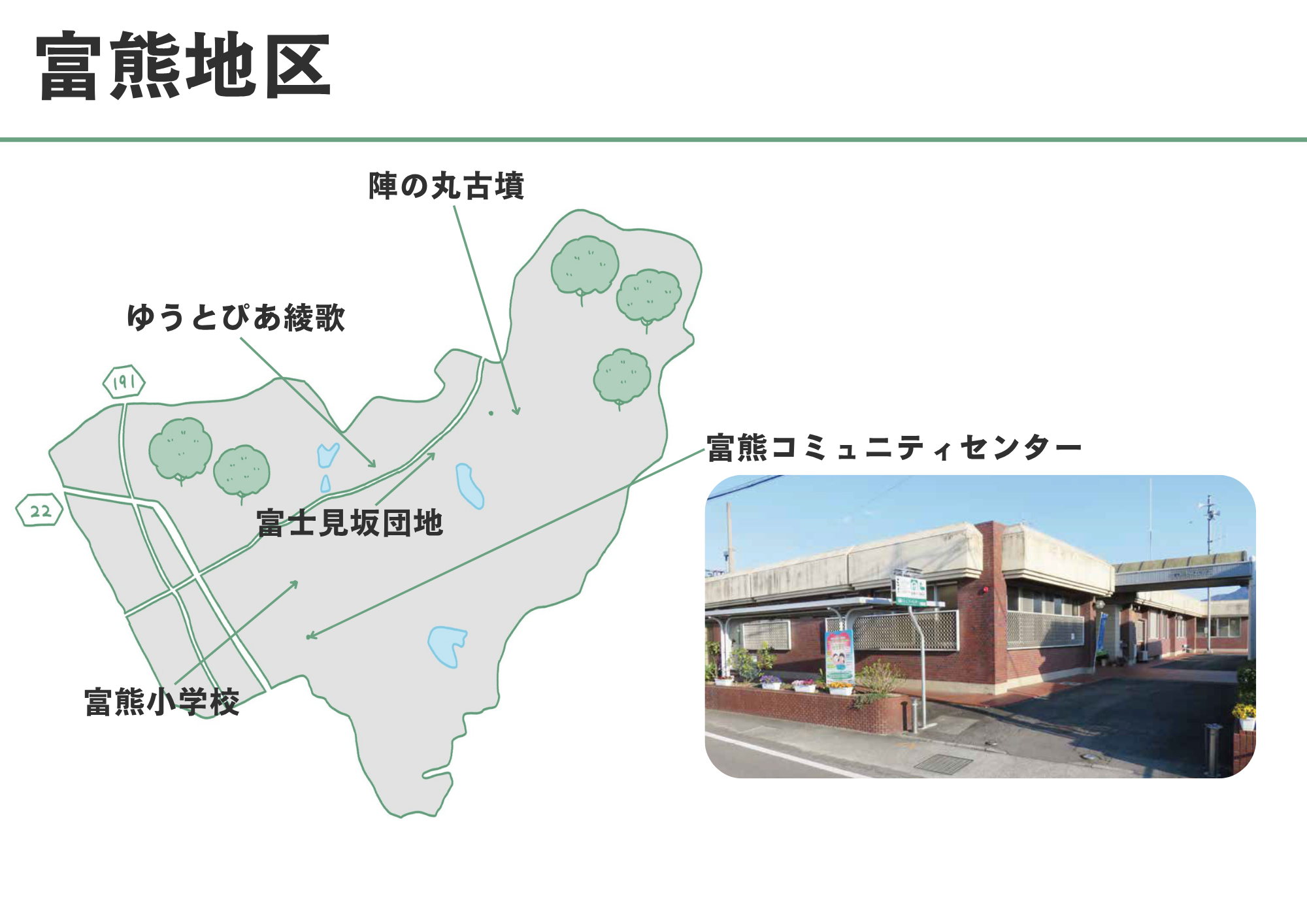 富熊地区には、「富熊コミュニティセンター」と分館である「ゆうとぴあ綾歌」、2つのセンターがあることが特長です。